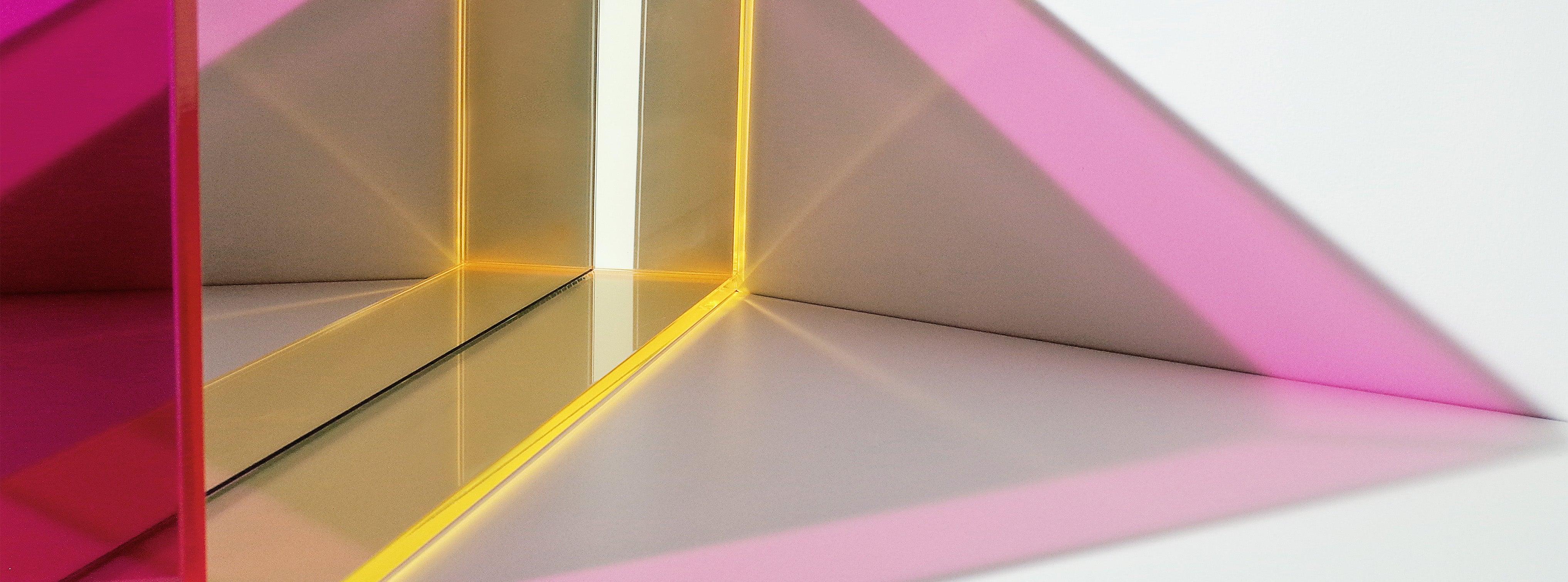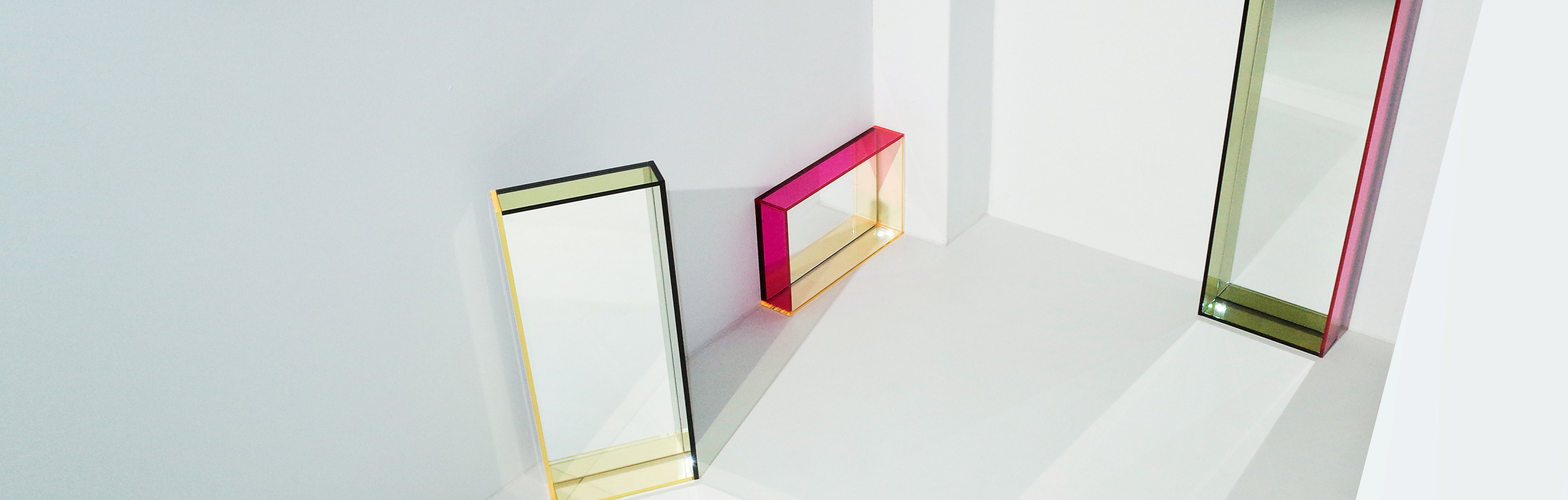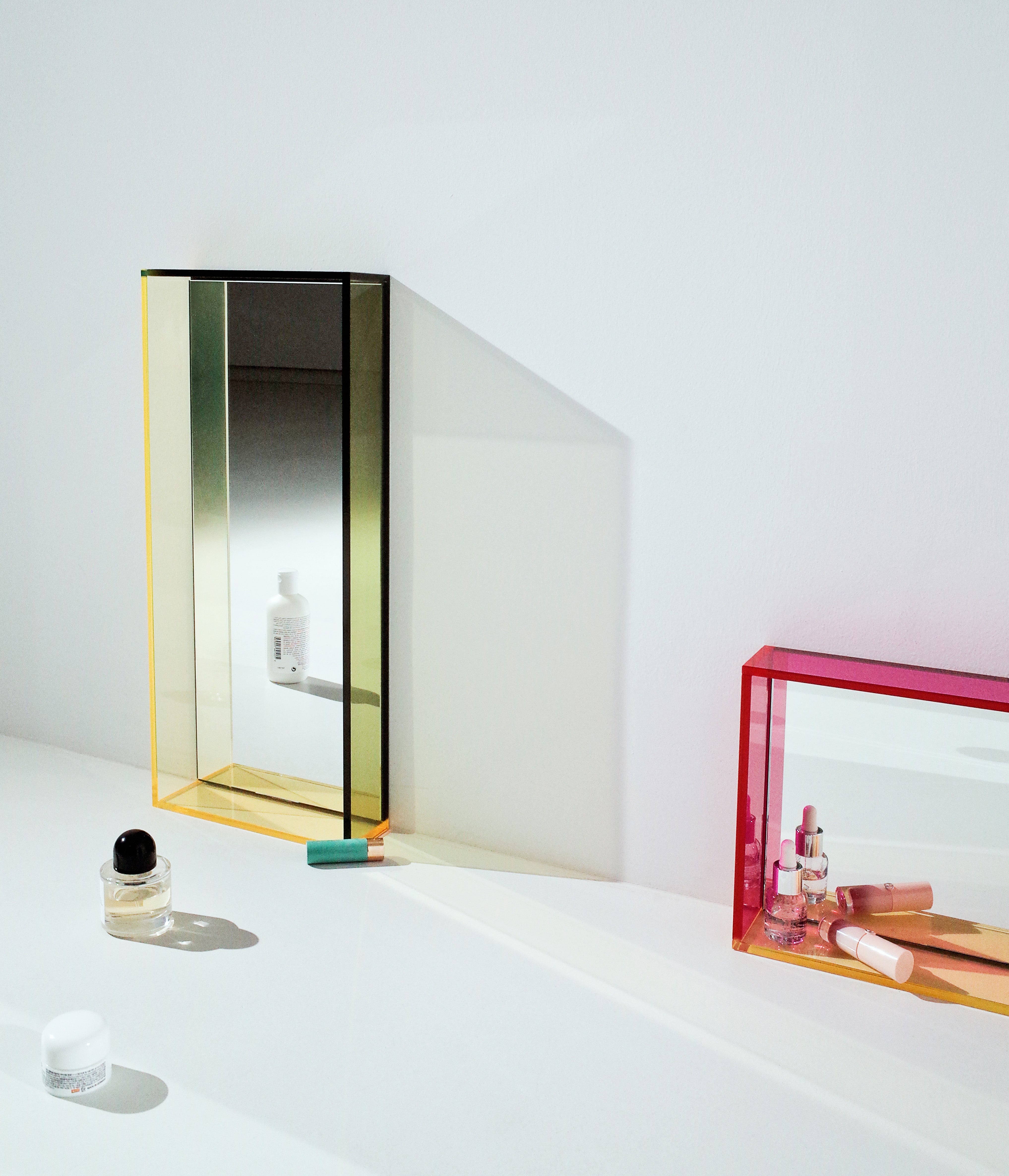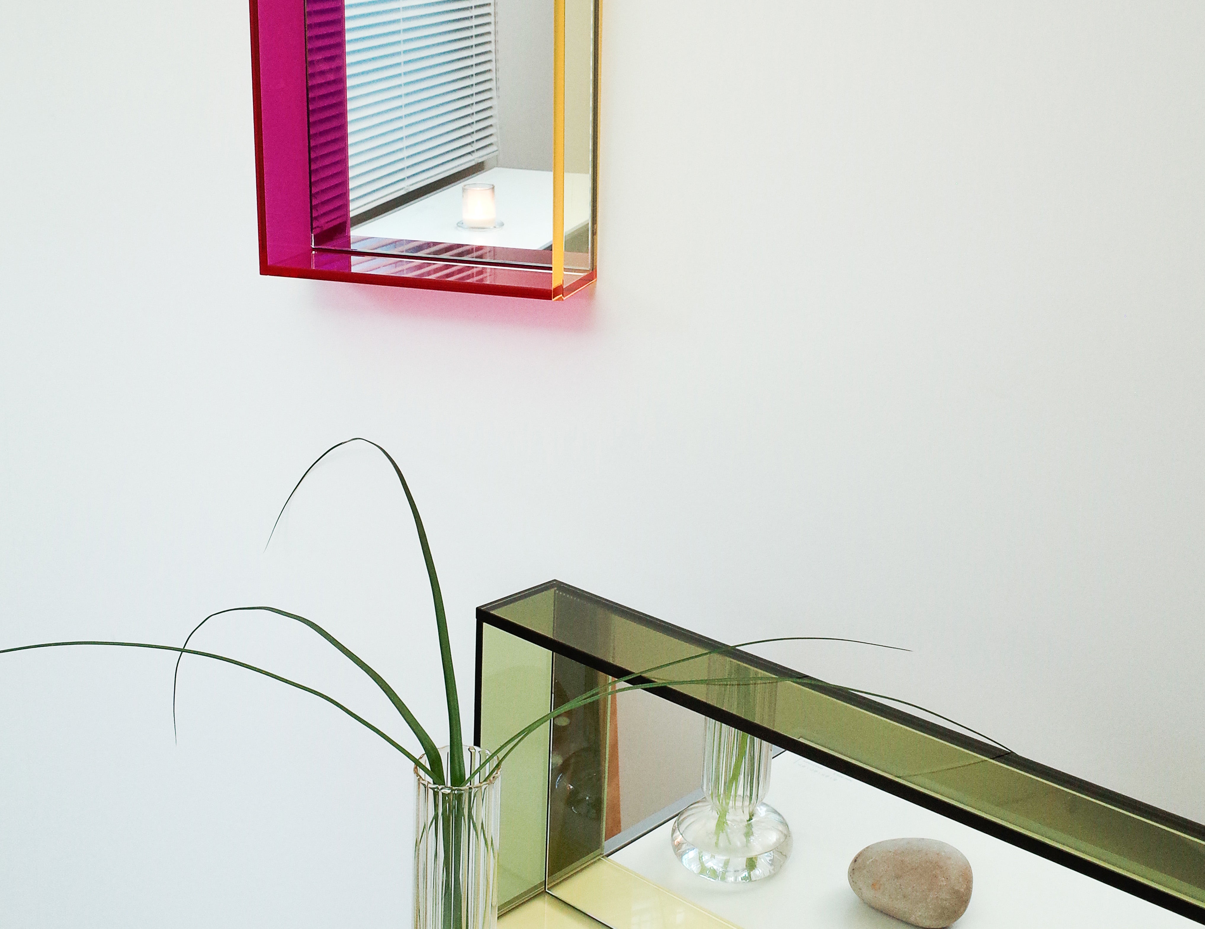 Crafted with high-clarity glass and colored acrylic, each mirror features softened corners for a safe and polished finish. The layered colors create an optical illusion that feels both retro and futuristic.