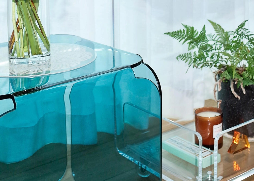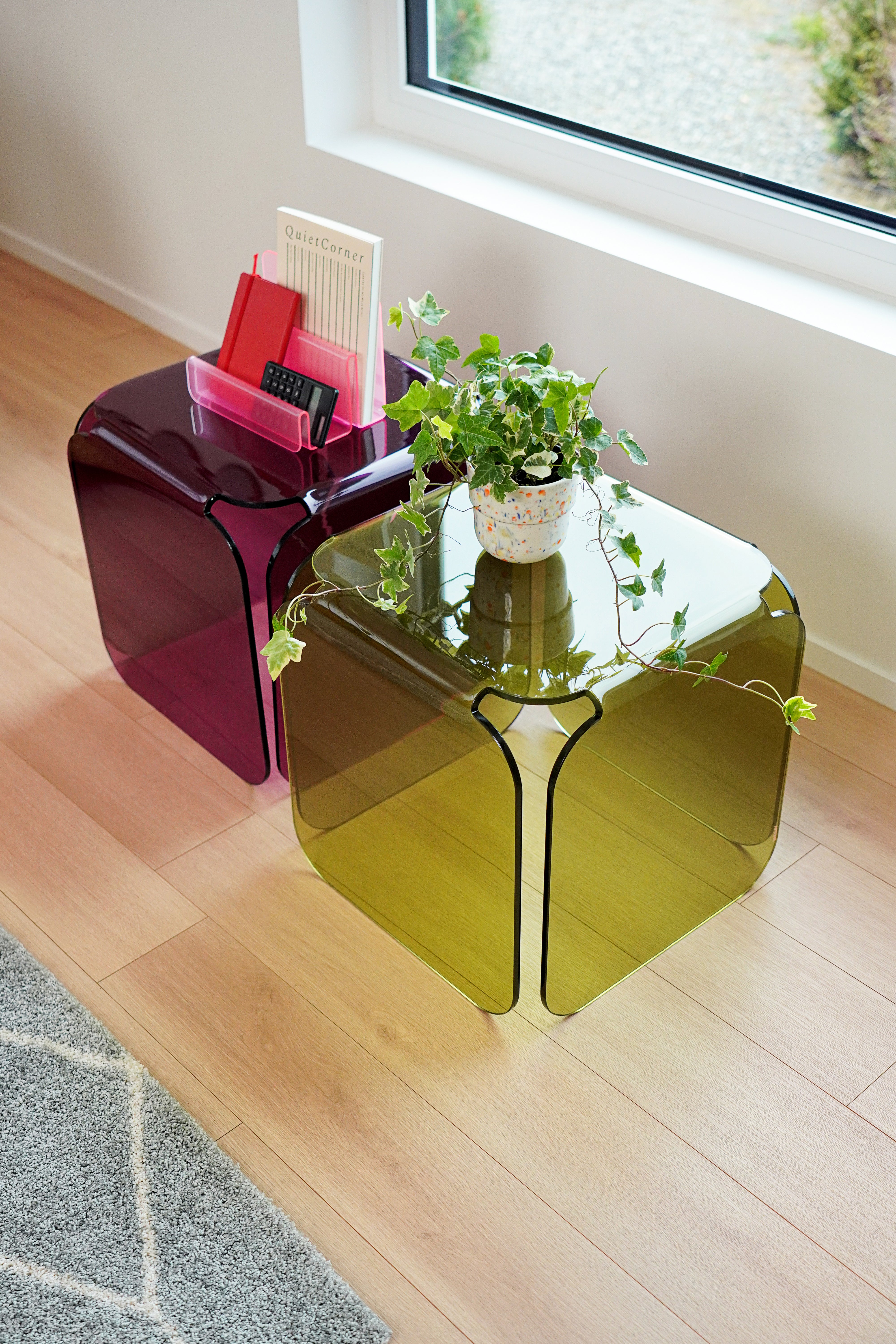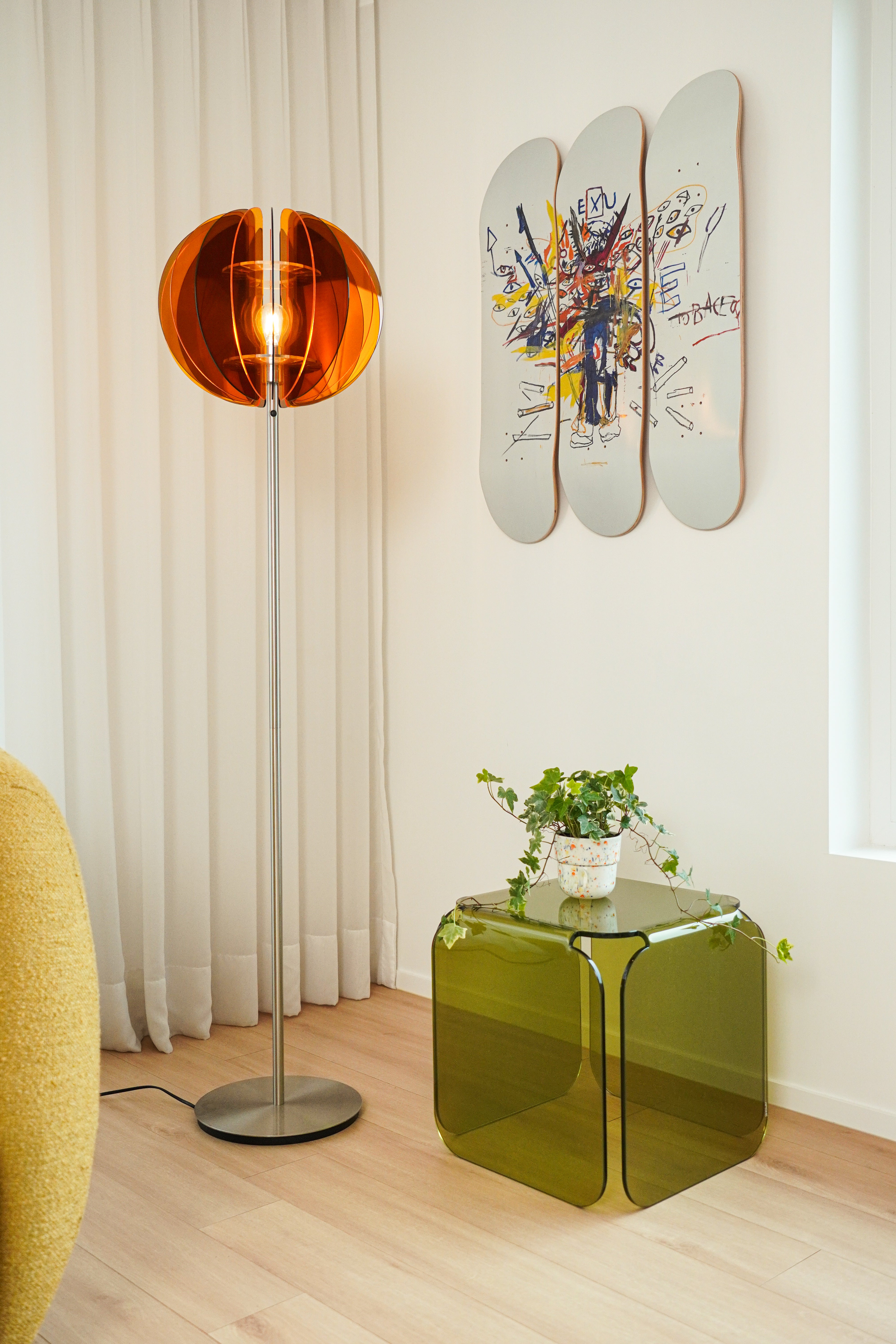 Its rounded square form and transparent acrylic body catch light from every angle, transforming any corner into a design moment.