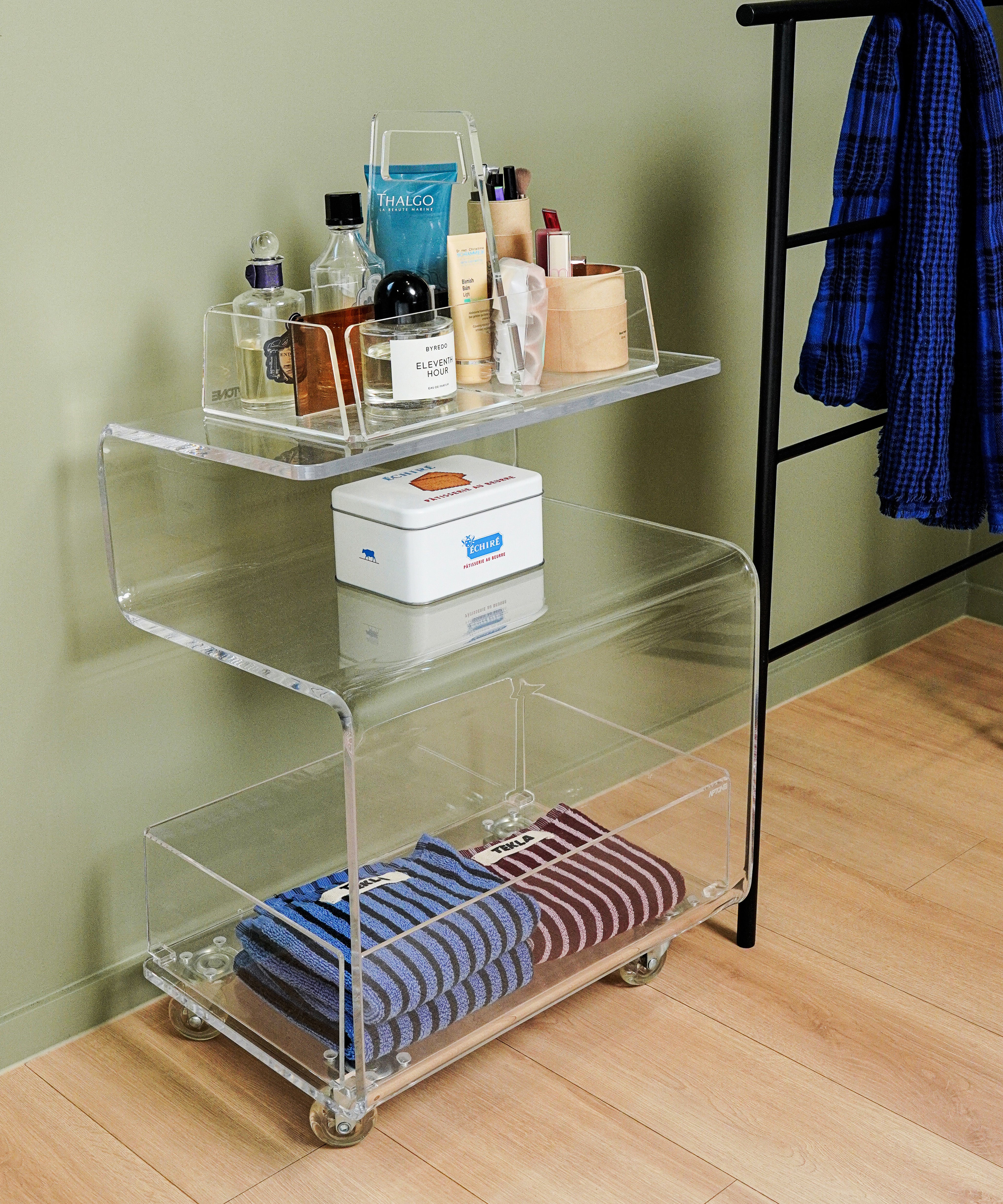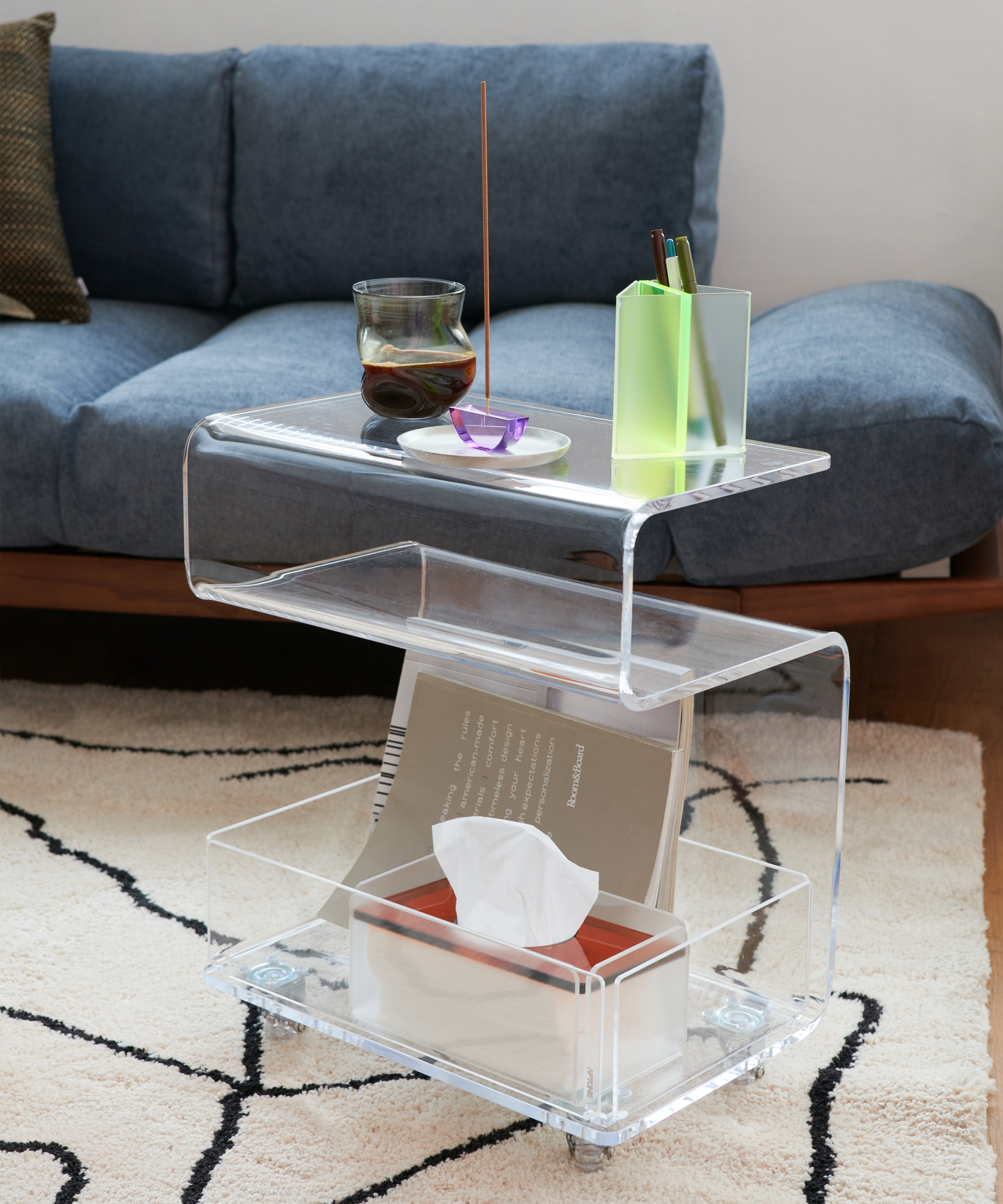 The transparent body blends in, while the design stands out. It’s a storage piece, a display stage, a quiet showstopper.
