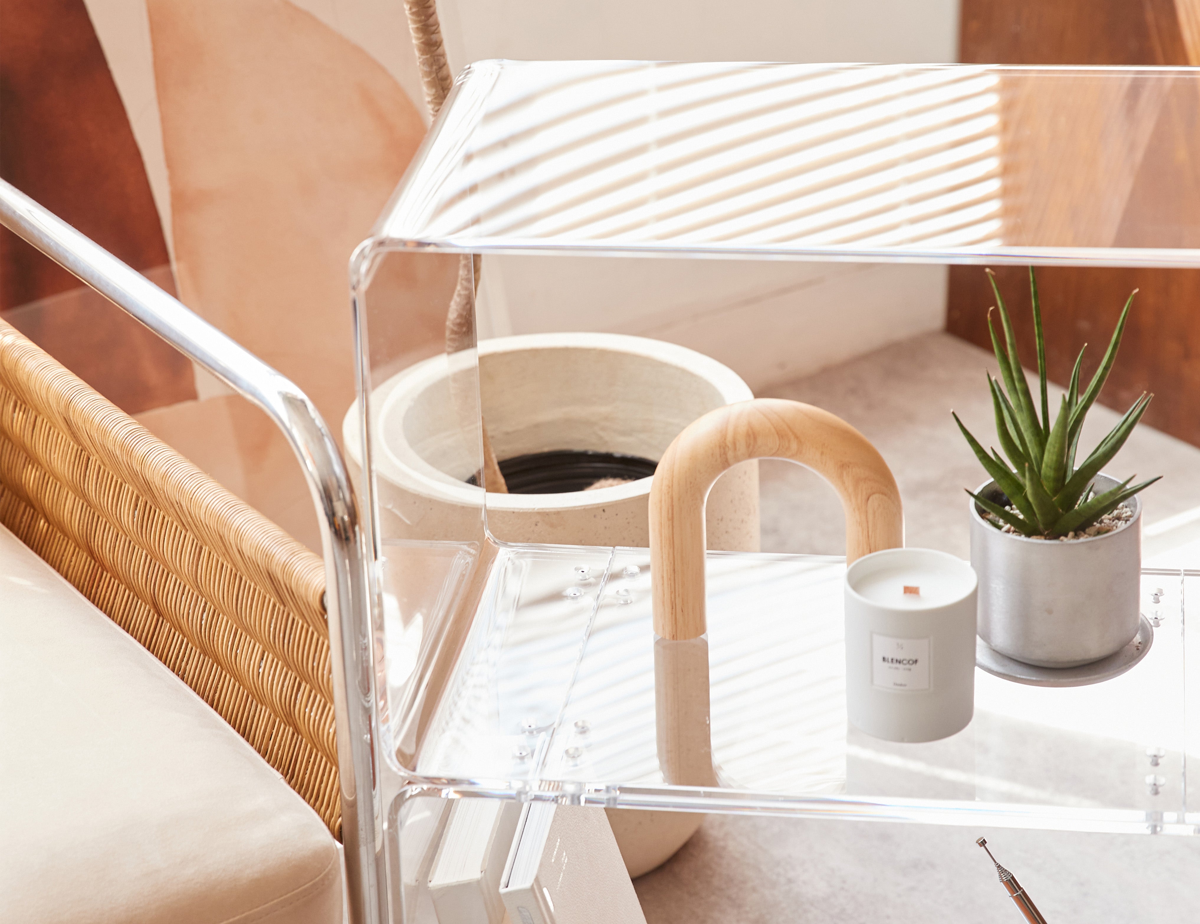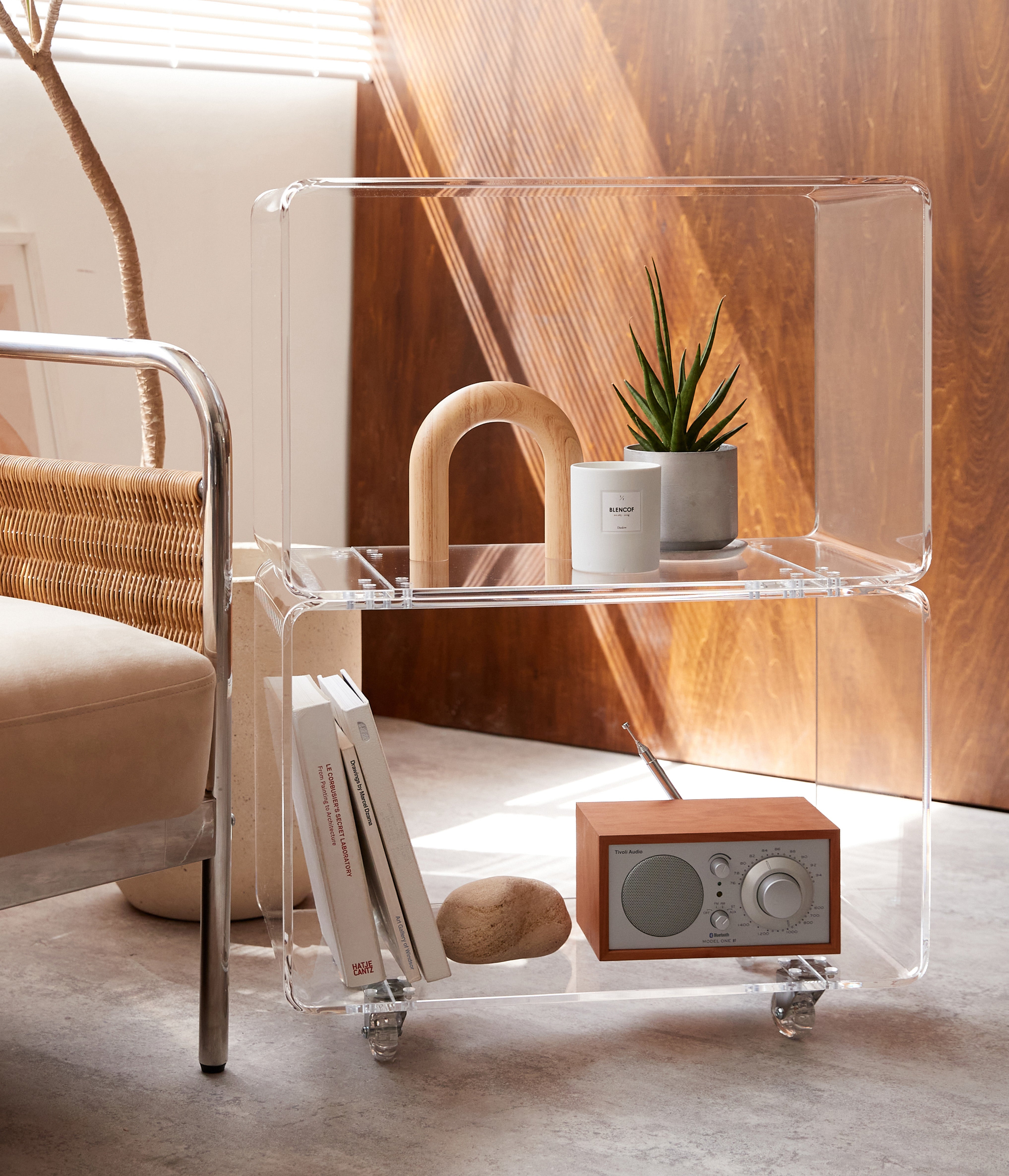 Its transparent acrylic makes it visually unobtrusive, while the robust shape gives it purpose — from bedside to living room to studio.