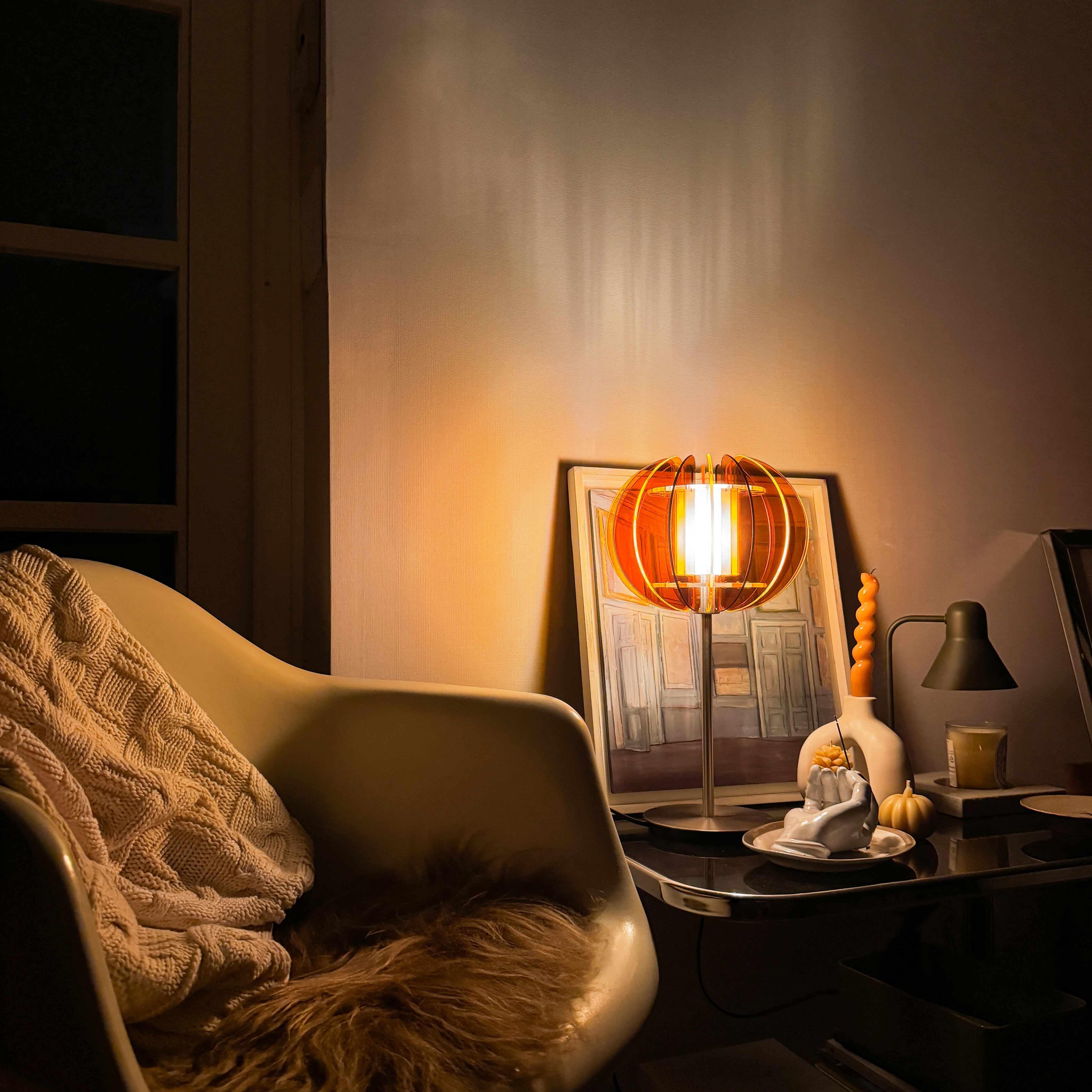 どんな部屋にも溶け込むようにデザインされたこのランプは、居心地の良い隅やオープンシェルフの両方を引き立てる、やわらかく黄金色の光を放ちます。ベッドサイドランプ、読書灯、またはムード照明として最適です。