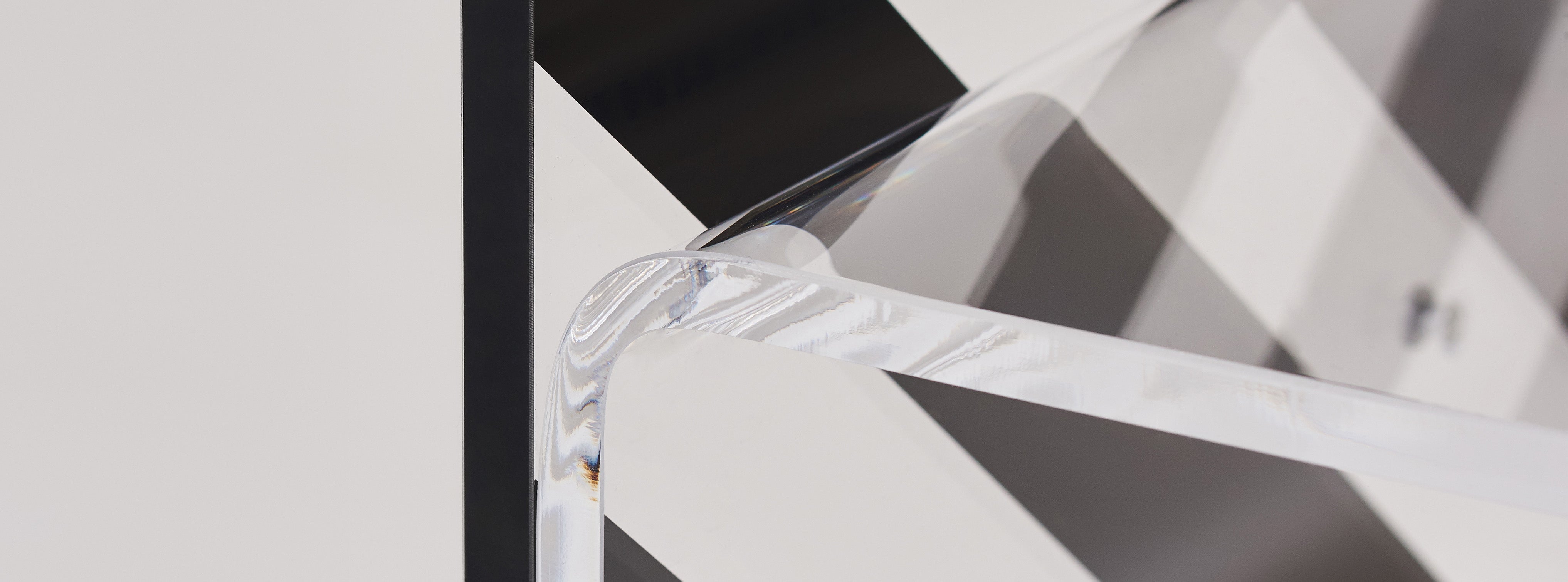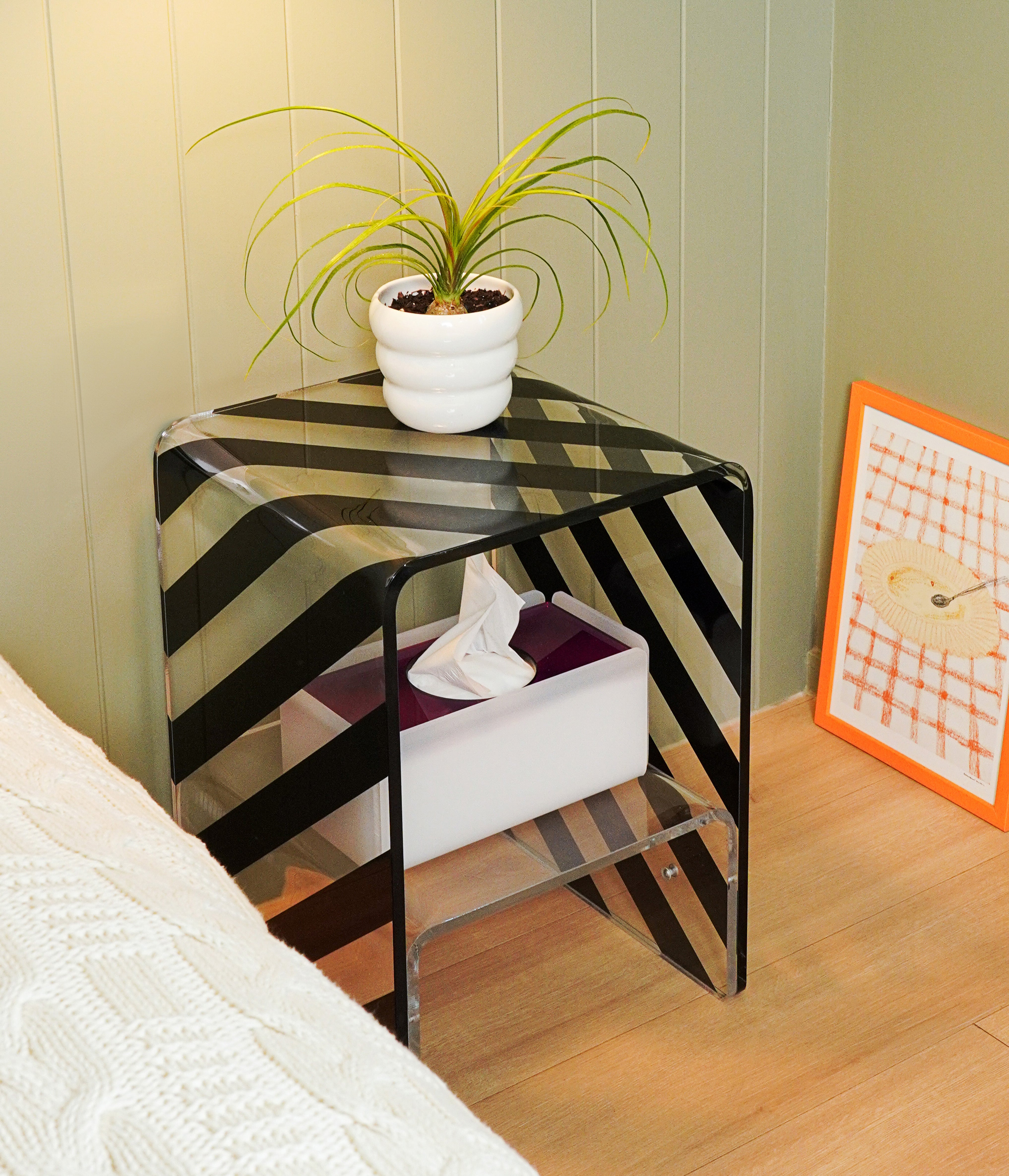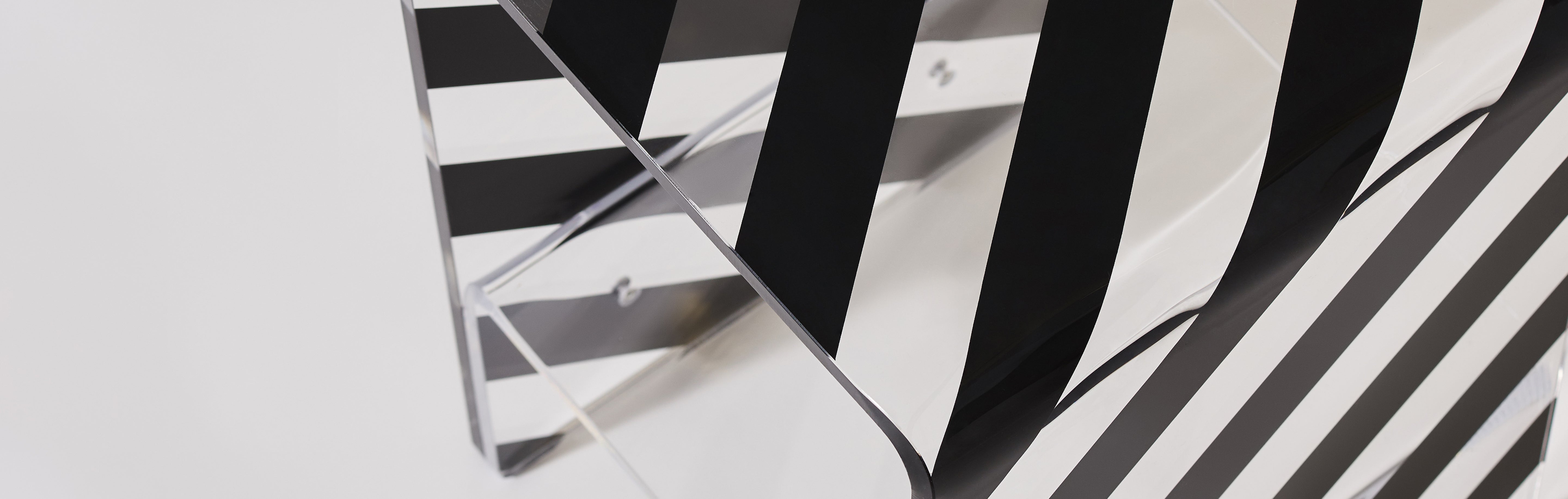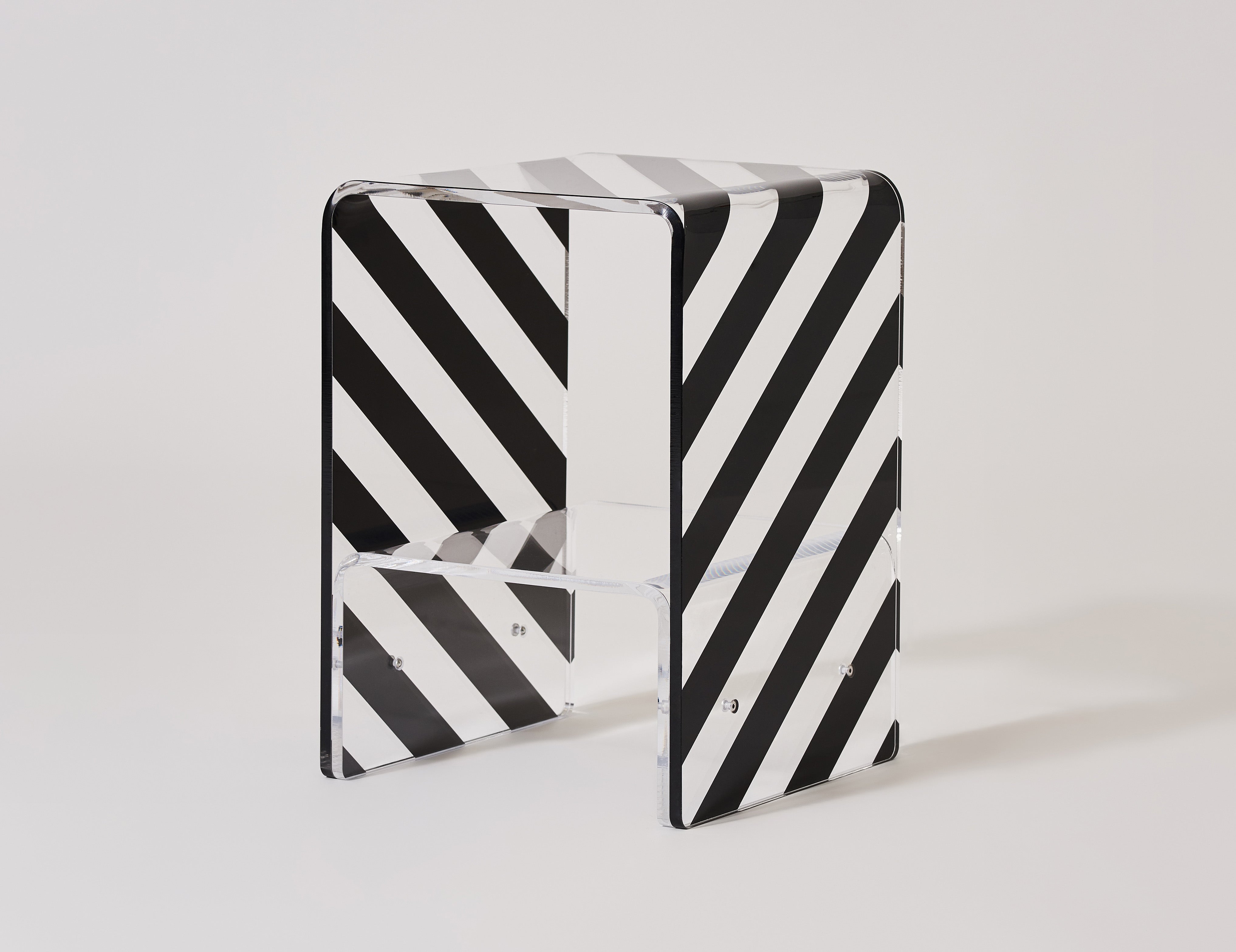 Mini Chair_Stripe transforms a simple form into a bold statement. With black-and-white diagonal striping printed onto transparent acrylic, it brings modern energy and visual rhythm to any space.